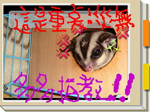 9 . 小蜜開眼近兩個月後...要換籠子...至少50*50*50cm的籠子....這樣牠才有足夠的空間可 以跳來跳去..小蜜接近飛鼠..空間必須要大一點..而且籠子也要放一個窩...冬天要放保溫燈..等等東西...所以籠子不可以太小...高雄地區可以參考我家訂的那組....便宜又大碗....600大洋搞定....
